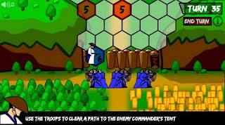 There is a second phase to the game where the player could 'deploy' troops (in blue) to help him break thru enemy grounds. So the trick is to slowly make the way towards the main enemy camp. The game mechanics for this part is not well explained, but generally if the blue number is bigger, it is easier to win over the red area. Seems a little bit like the board game of 'Risk'.